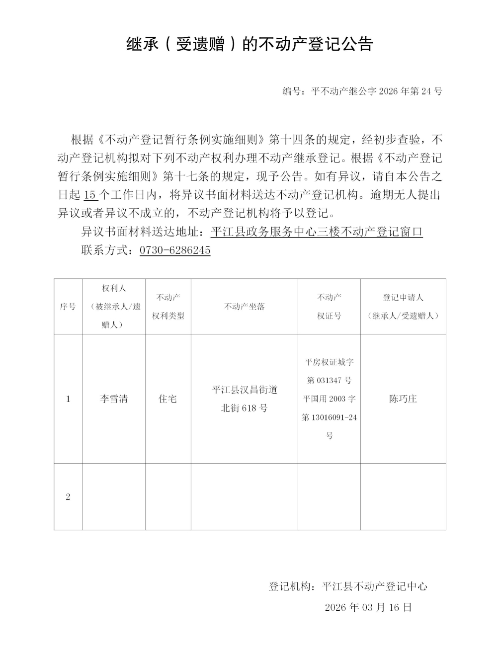 陈巧庄 继承不动产登记公告202624