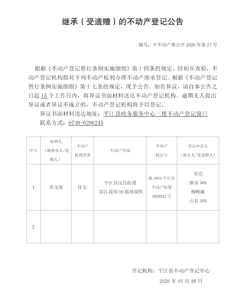 黄亮 继承不动产登记公告202627