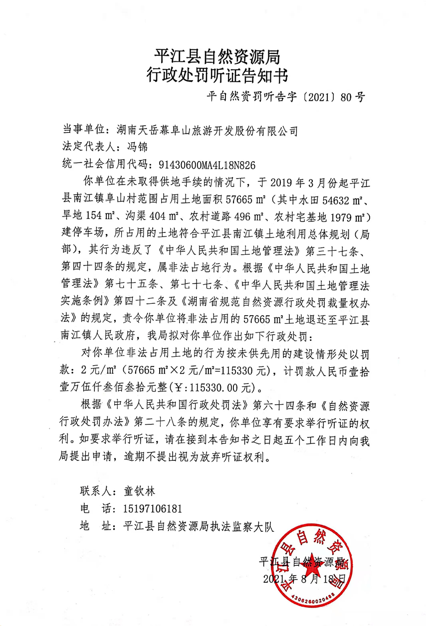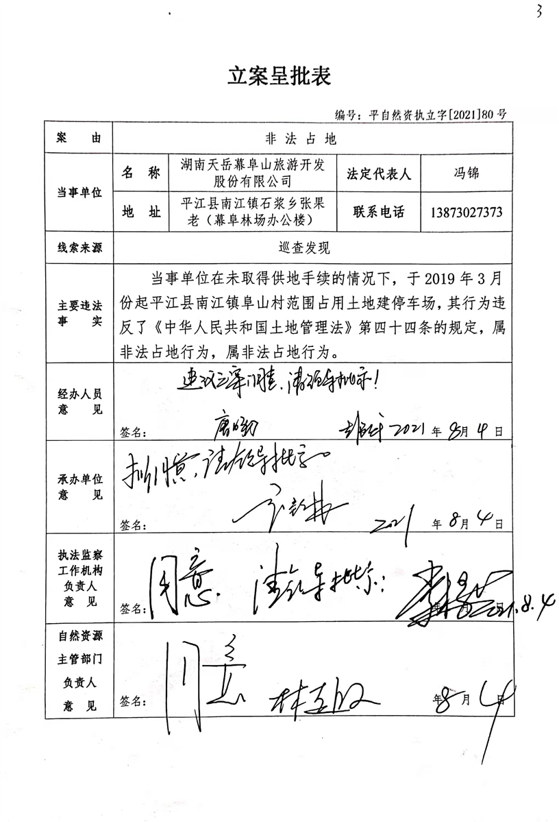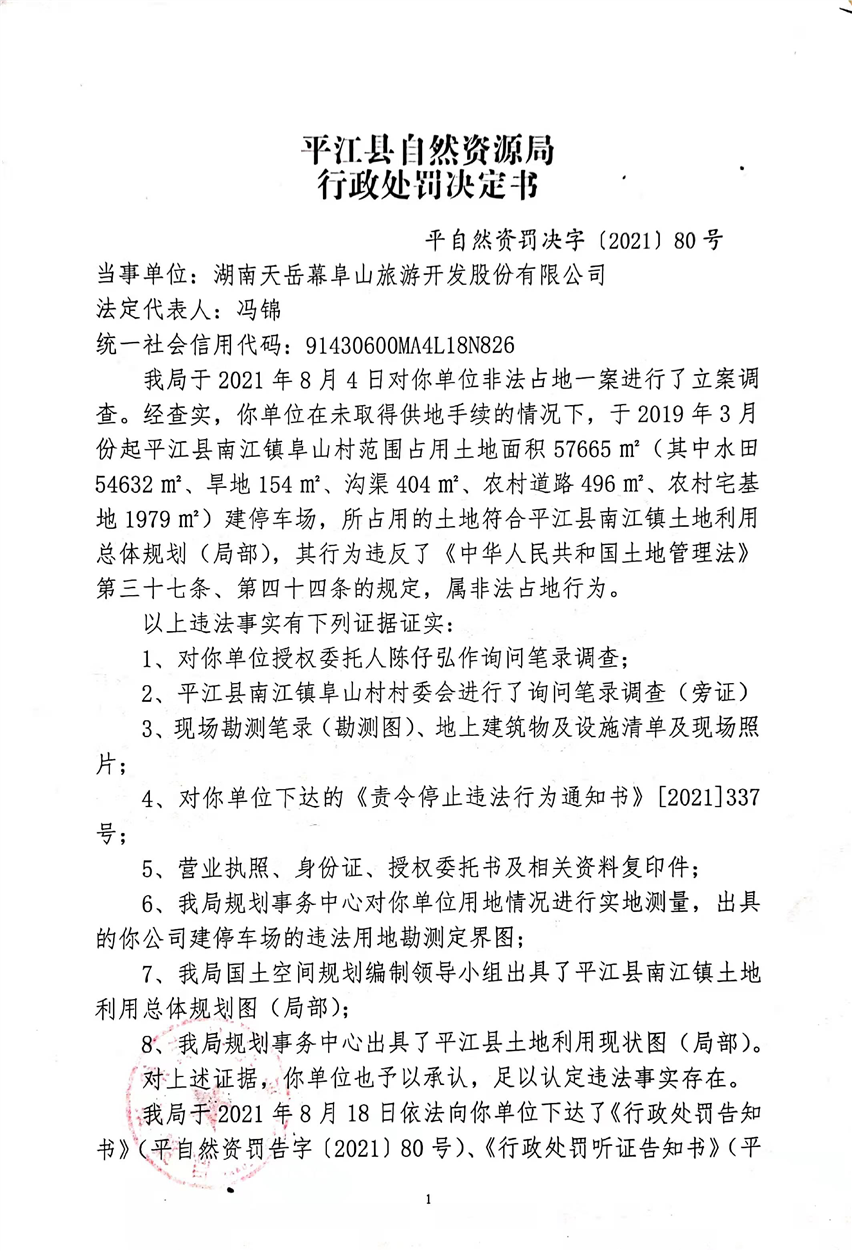 湖南天岳幕阜山旅游开发股份有限公司非法占地