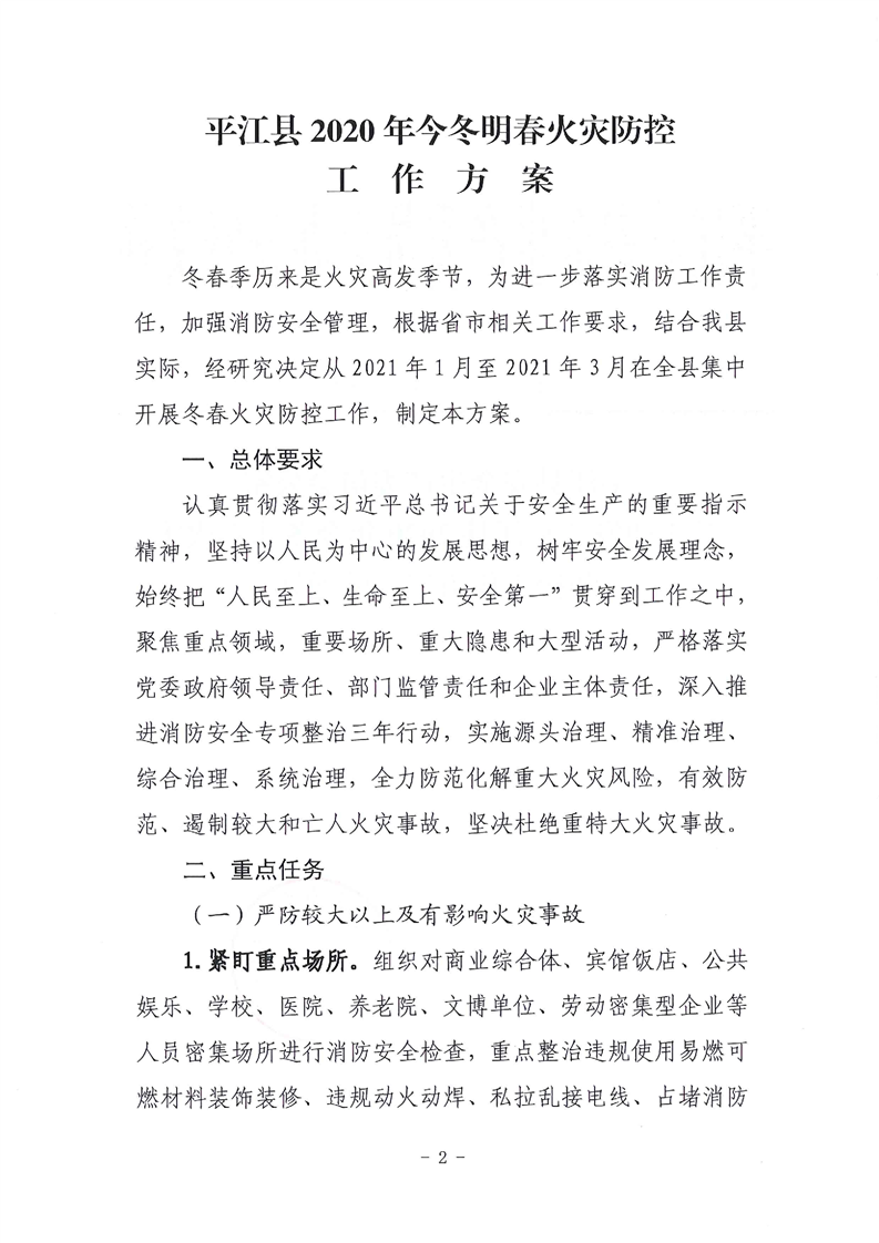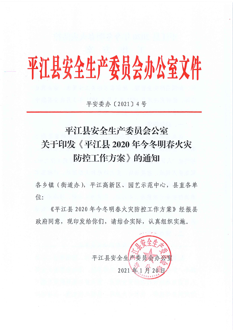 关于印发《平江县2020年今冬明春火灾防控工作方案》的通知
