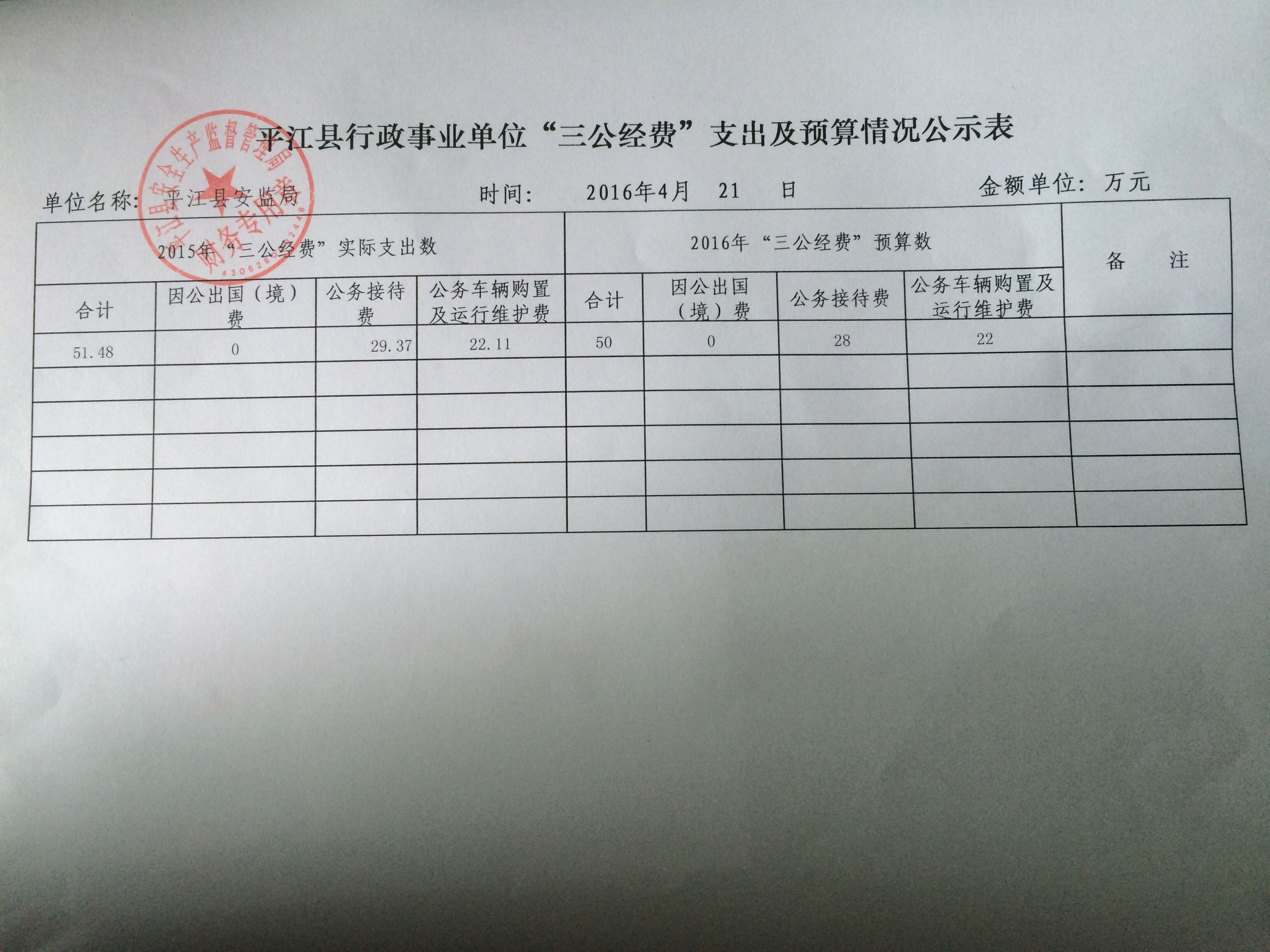 平江县安监局2015 年“三公经费”实际支出及2016年“三公经费”预算情况公示表
