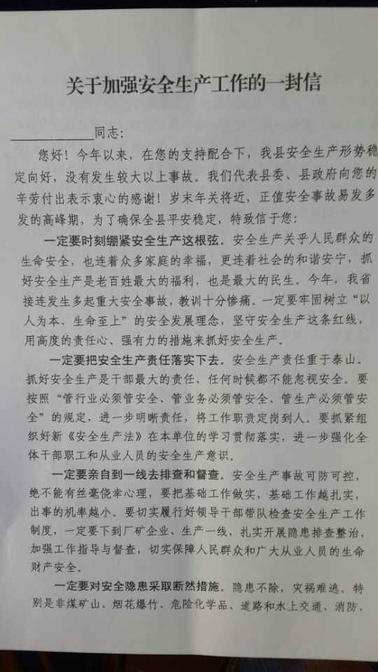 信中强调,安全生产关乎人民群众的生命安全,也连着众多家庭的幸福,更连着社会的和谐稳定,要求全县各级各部门各单位负责人一定要时刻绷紧安全生产这根弦,一定要把安全生产责任落实下去,一定要亲自到一线去排查和督查,一定要对安全隐患采取断然措施,一定要坚守安全生产底线,确保全县安全生产形势持续稳定向好,确保人民群众生命财产安全。