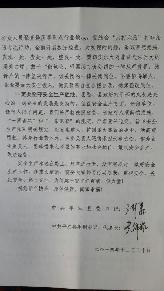 为认真学习贯彻党的十八届四中全会和省、市安全生产工作会议精神,贯彻实施新《安全生产法》,推进依法治安,切实抓好岁末年初安全生产工作,今日,县委书记汪涛和县委副书记、代县长黄伟雄向全县各乡镇党政负责人、各部门单位一把手和企业负责人写了一封安全生产公开信(附后)。