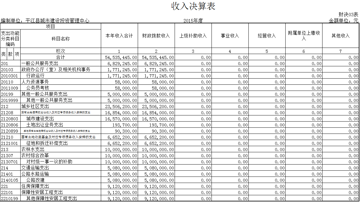 2015年全年财政支付指标下达总额度为5453.5445万元。其中行政运行182.9245万元;其他保障性安居工程支出912万元;城市建设支出1657万元;其他一般公共服务支出500万元;土地出让业务支出19.37万元;其他国有土地使用权出让收入安排的支出9.03万元;征地和拆迁补偿支出665.22万元;对村级一事一议的补助1000万元;公路改建508万元。全年管理中心收到财政指标拨付收入5453.5445万元,全年支付总额为5453.5445万元,实现收支平衡,年终无结余指标数。