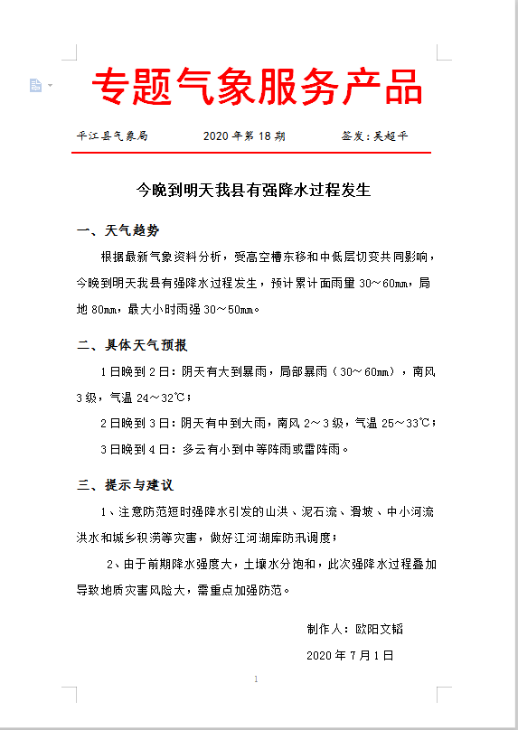 专题气象服务产品2020年第18期
