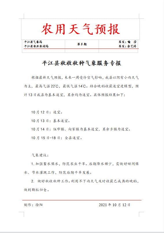 平江县秋收秋种气象服务专报第5期