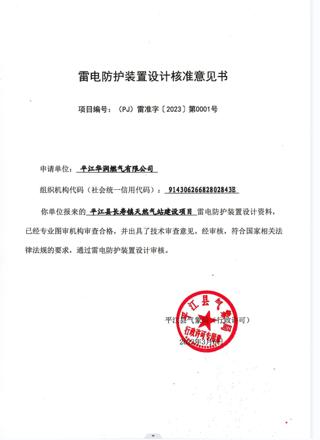 平江县长寿镇天然气站工程雷电防护装置设计核准意见书