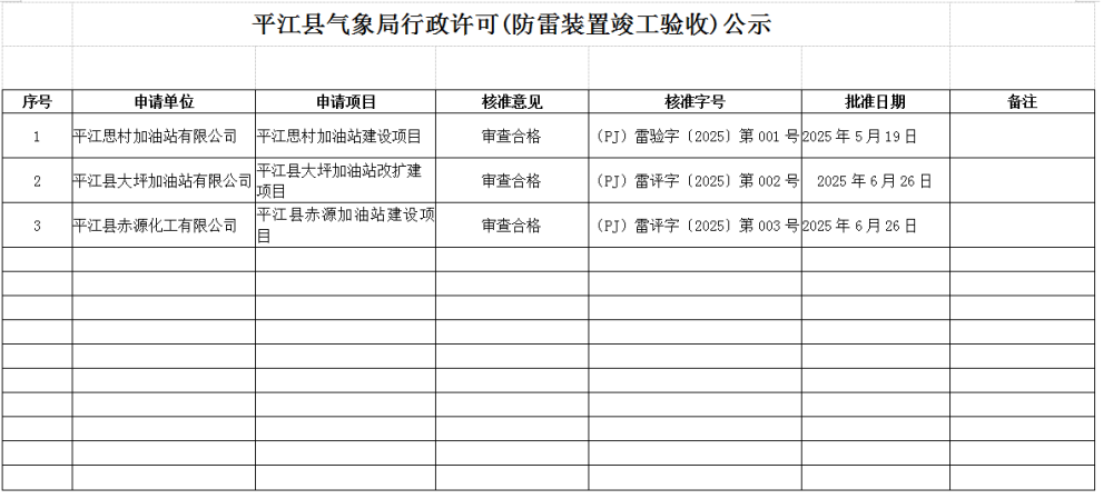 2025年5-6月平江县气象局行政许可(防雷装置竣工验收)公示