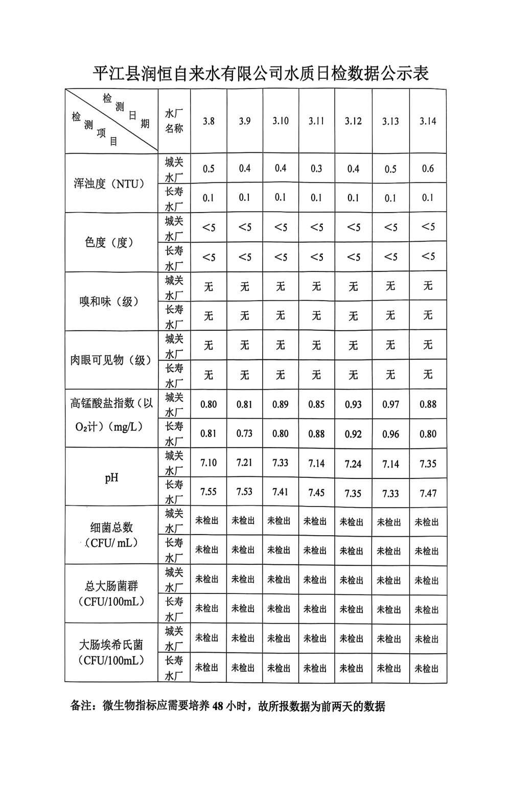 平江县润恒自来水有限公司水质日检数据公示表3.14