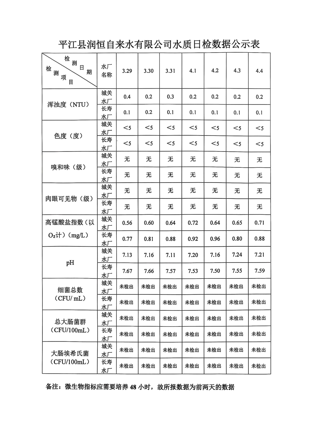 平江县润恒自来水有限公司水质日检数据公示表4.4