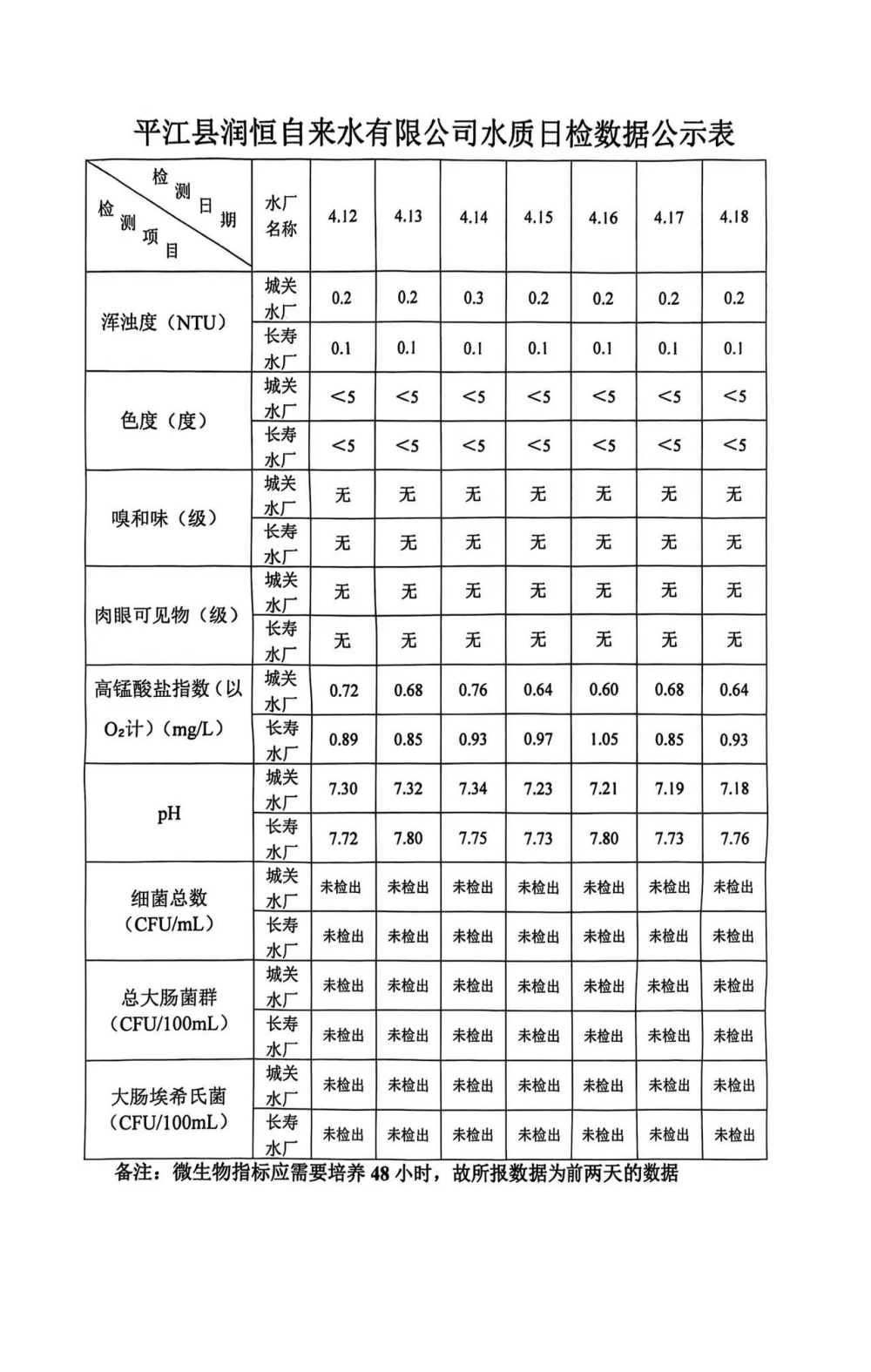 平江县润恒自来水有限公司水质日检数据公示表4.18