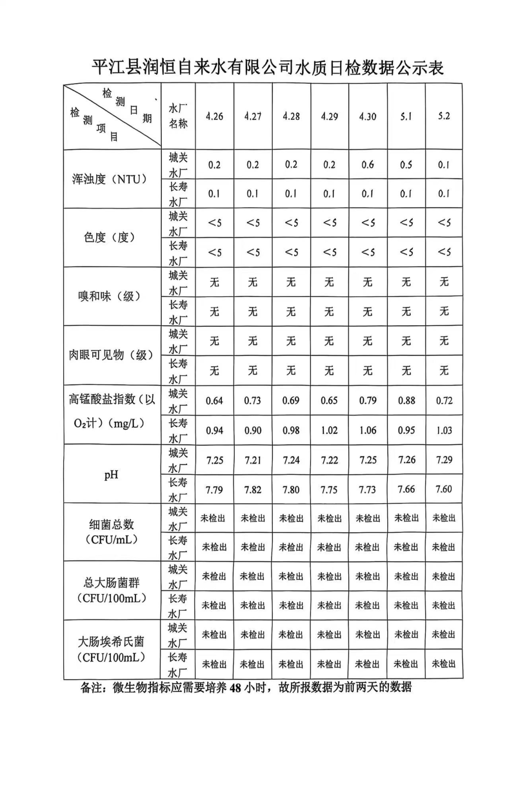 平江县润恒自来水有限公司水质日检数据公示表5.2
