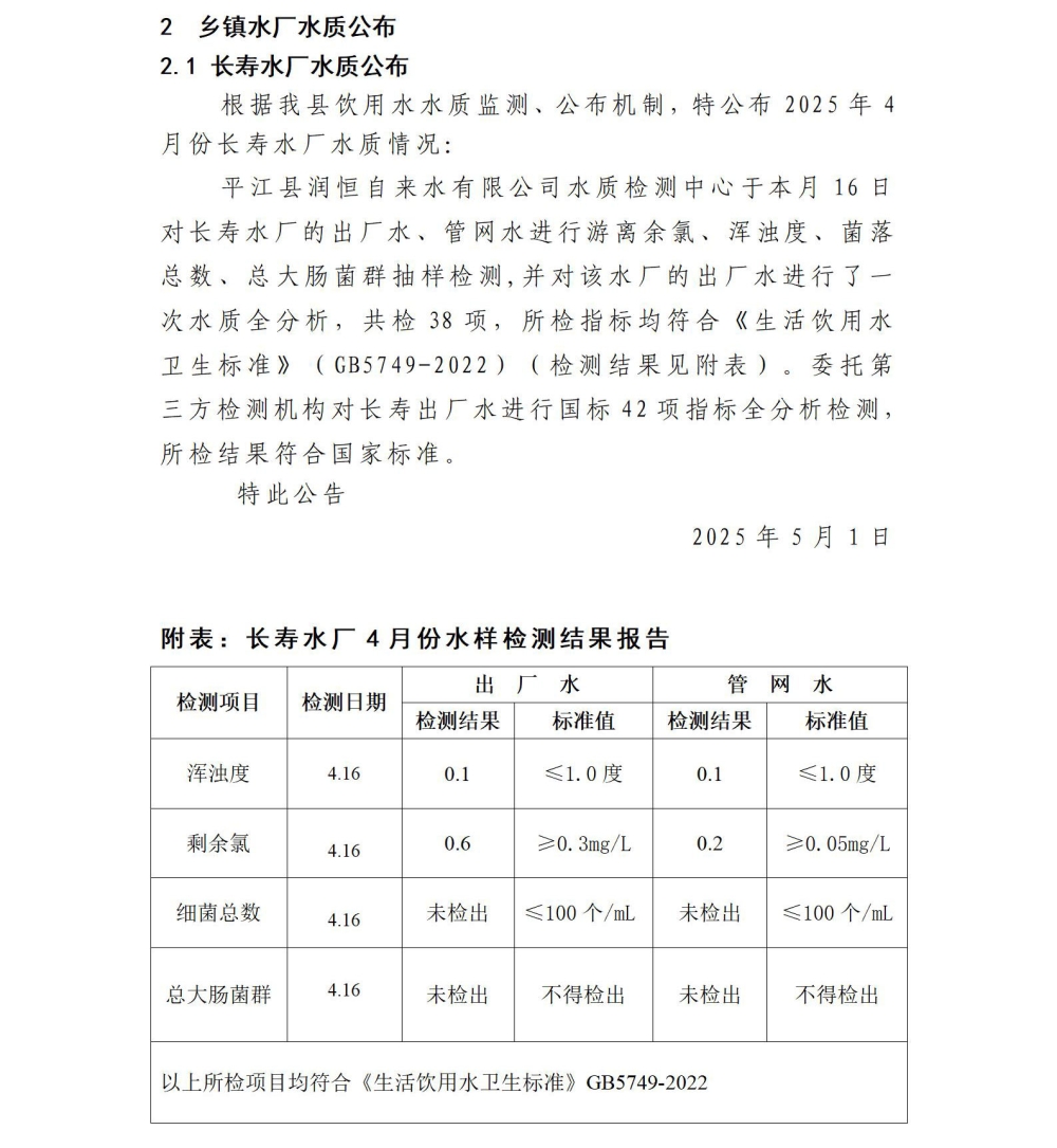 平江县润恒自来水有限公司2025年4月份水质公示