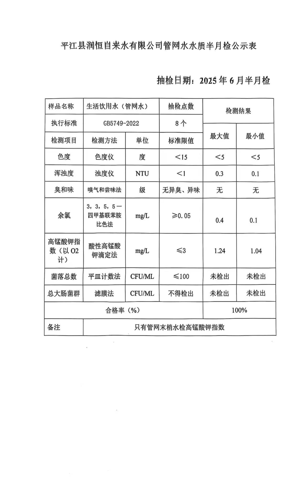 平江县润恒自来水有限公司管网水水质半月检公示表6.6