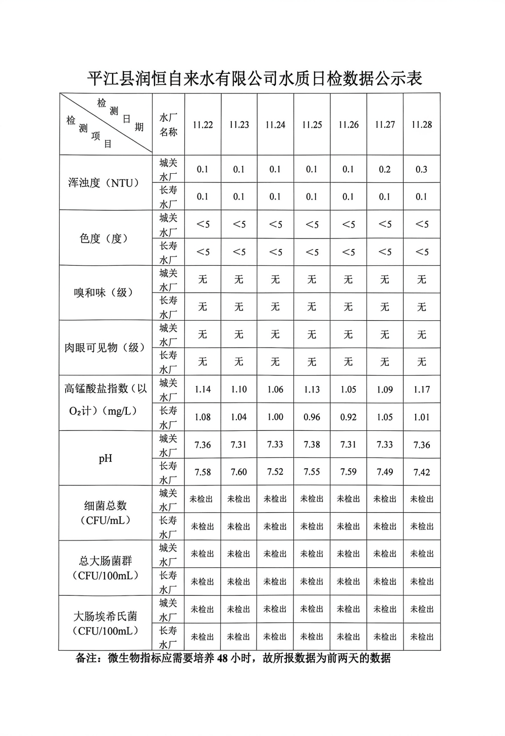 平江县润恒自来水有限公司水质日检数据公示表11.28