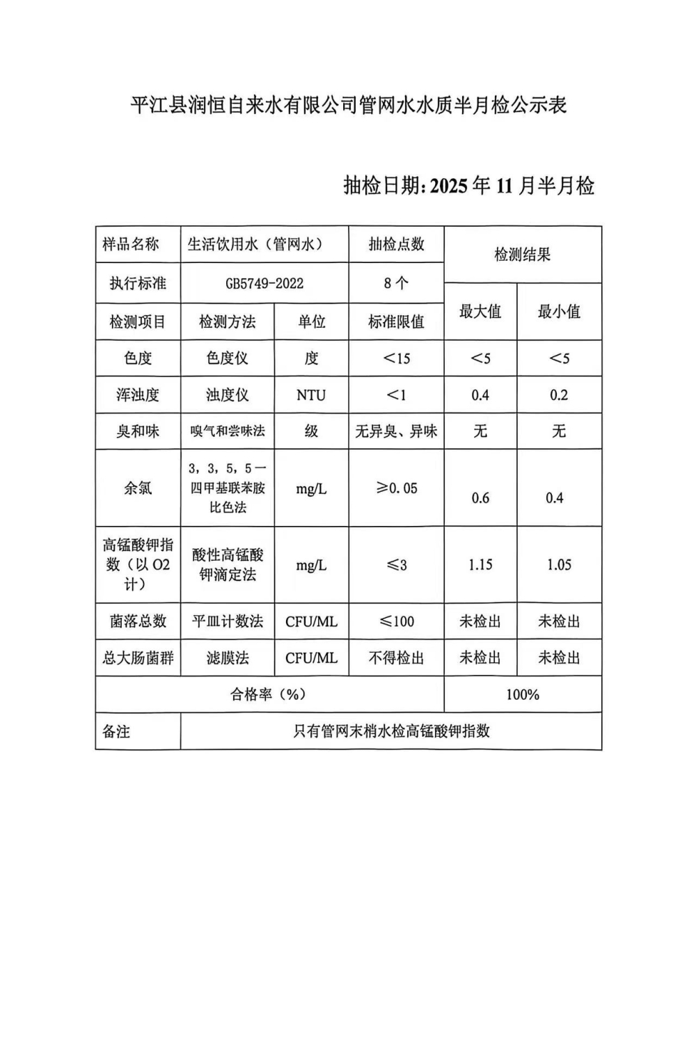 平江县润恒自来水有限公司管网水水质半月检公示表11.28