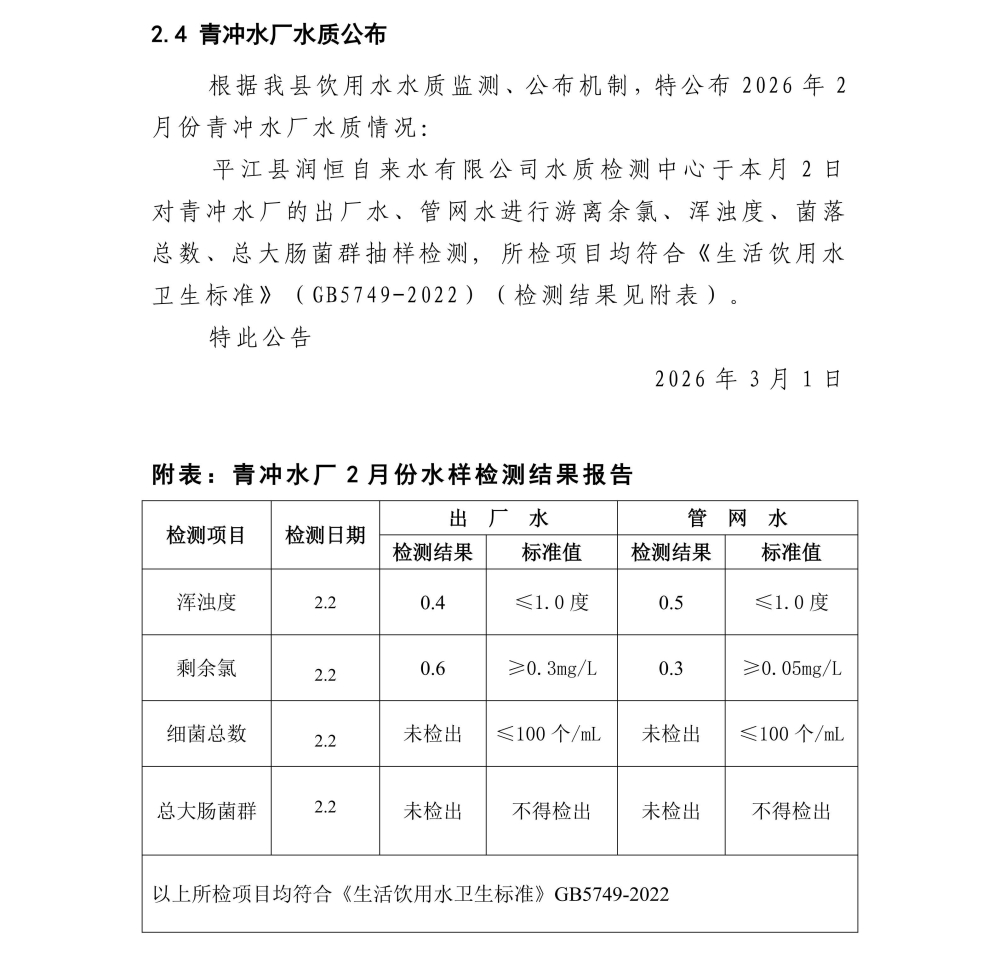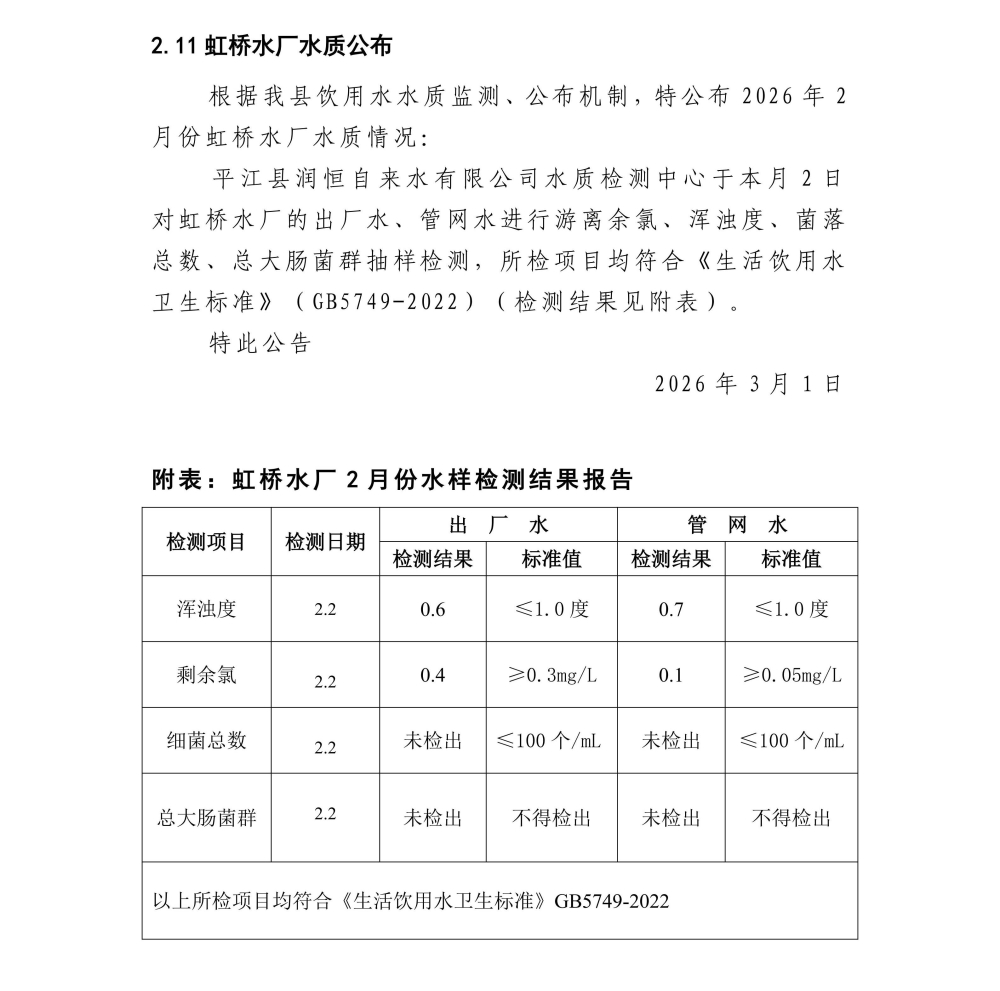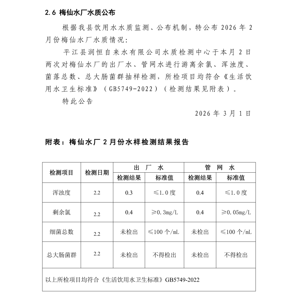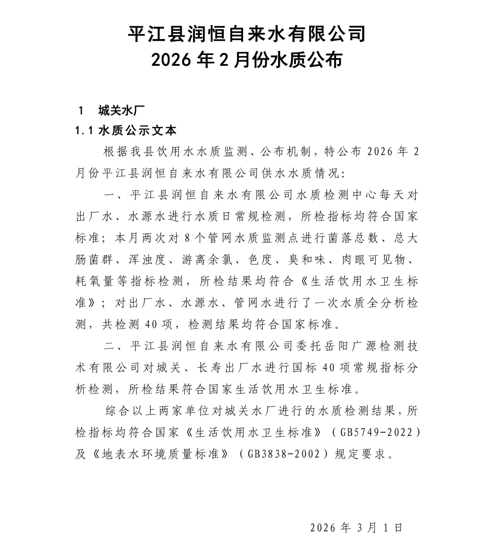 平江县润恒自来水有限公司2026年2月份水质公示