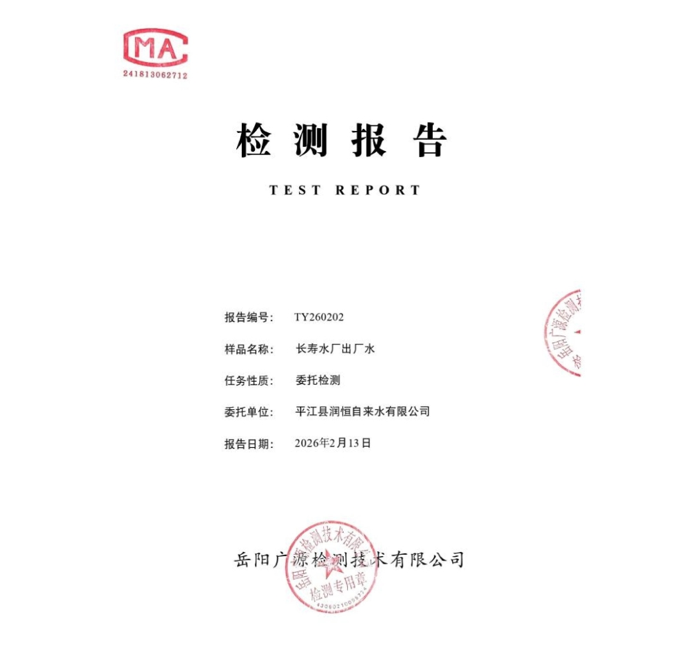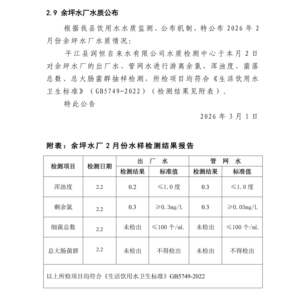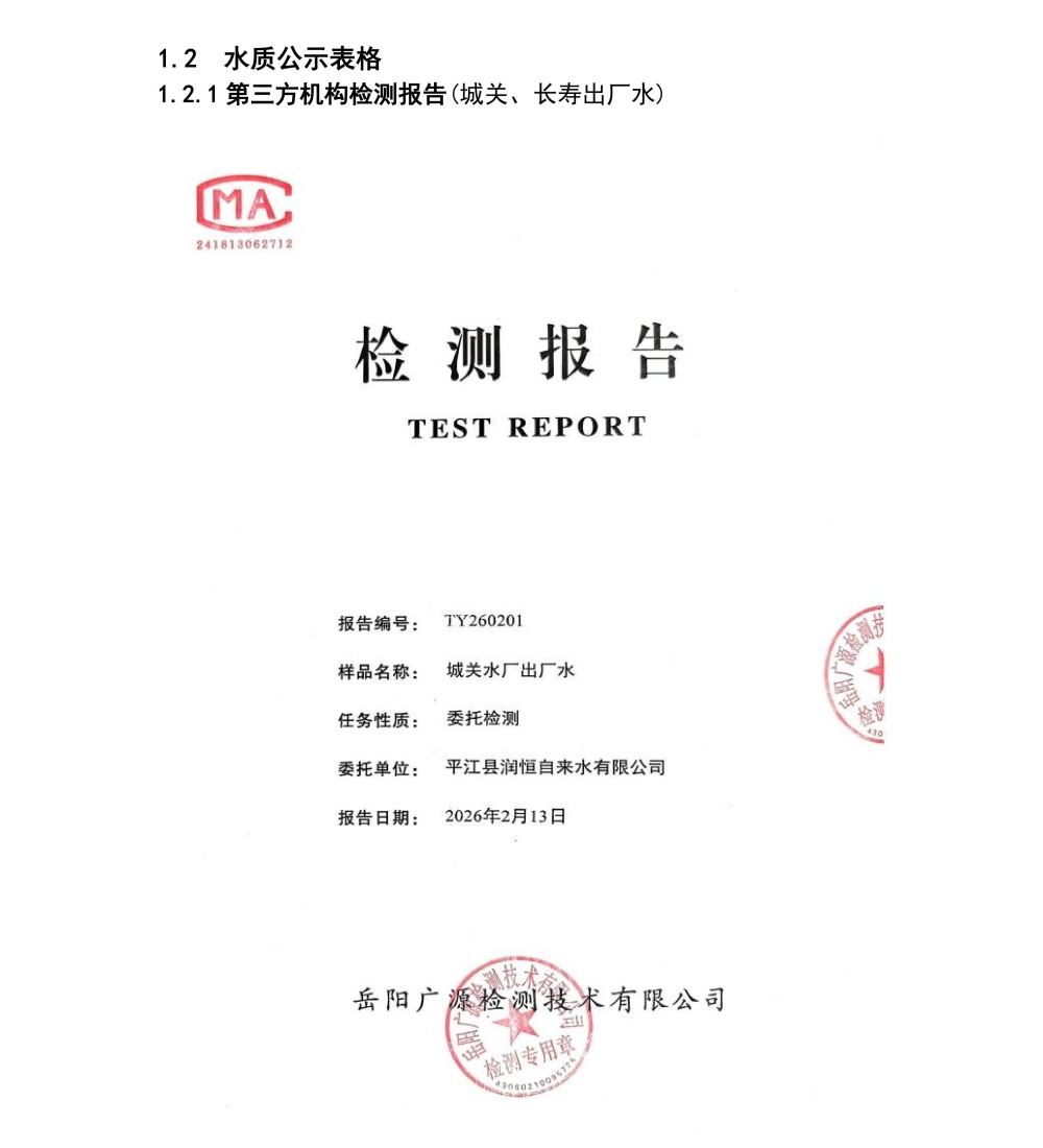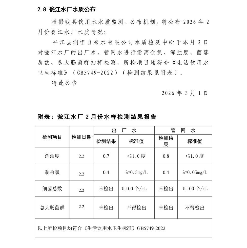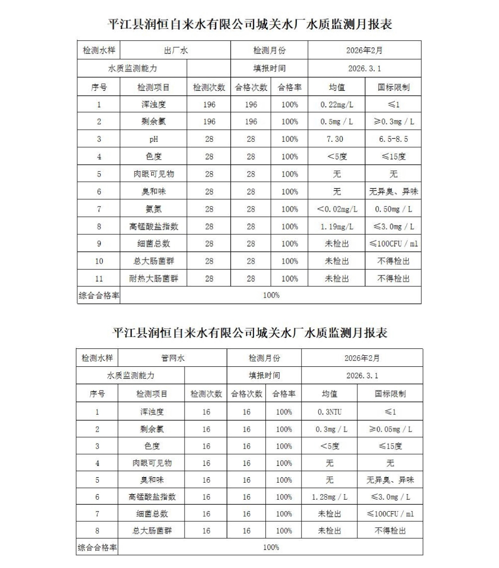 平江县润恒自来水有限公司2026年2月份水质公示