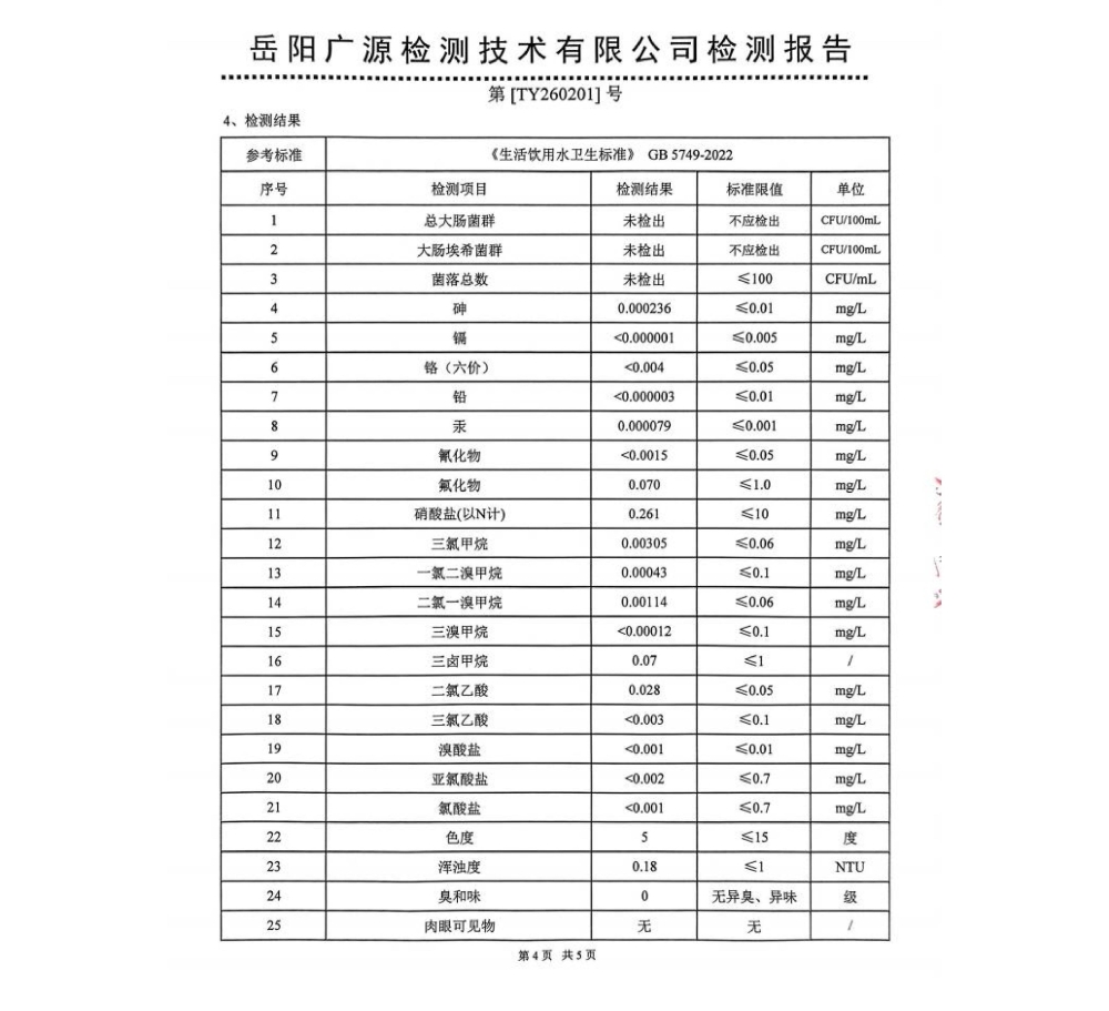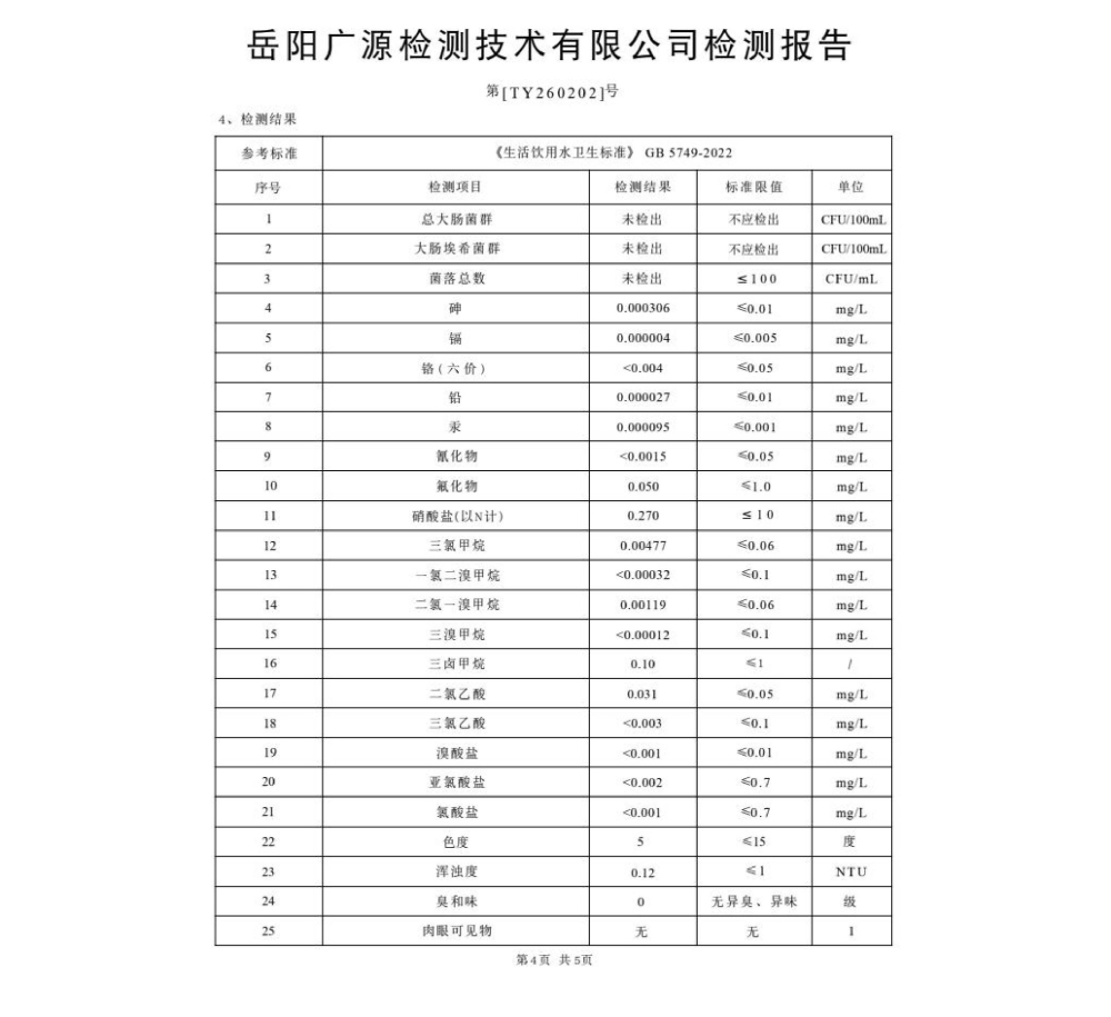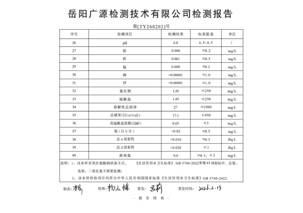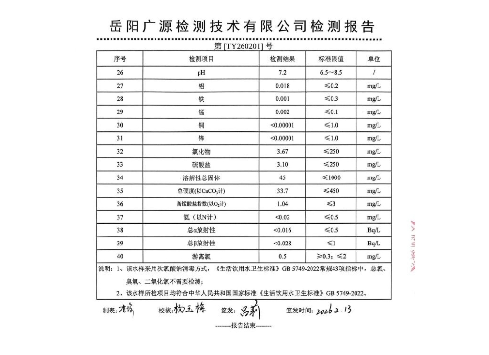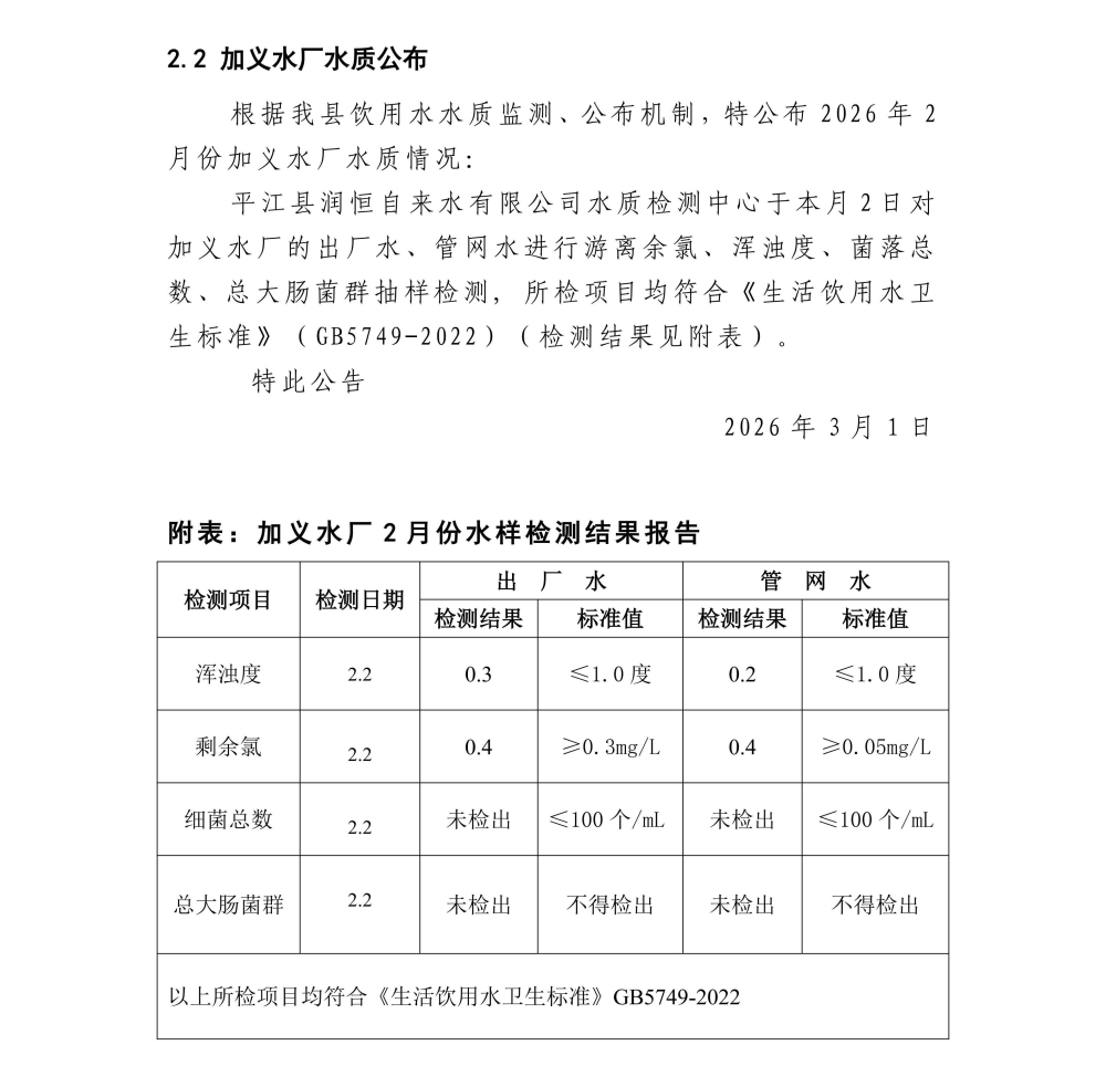 平江县润恒自来水有限公司2026年2月份水质公示
