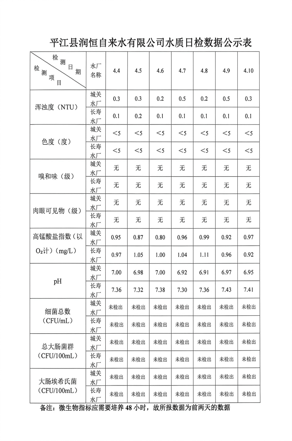 平江县润恒自来水有限公司水质日检数据公示表4.10