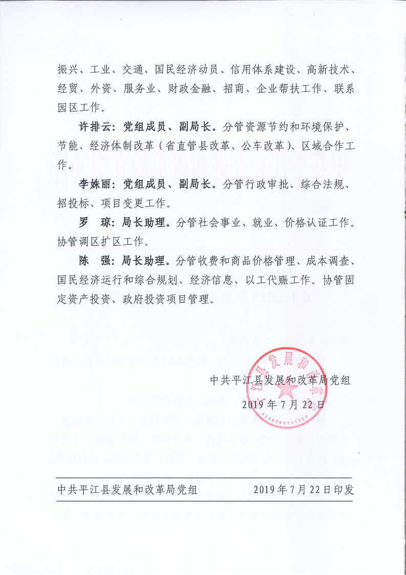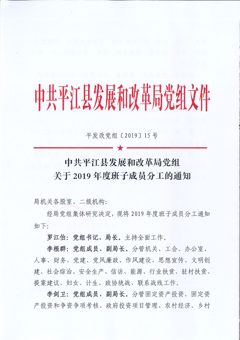 中共平江县发展和改革局党组关于2019年度领导班子分工的通知