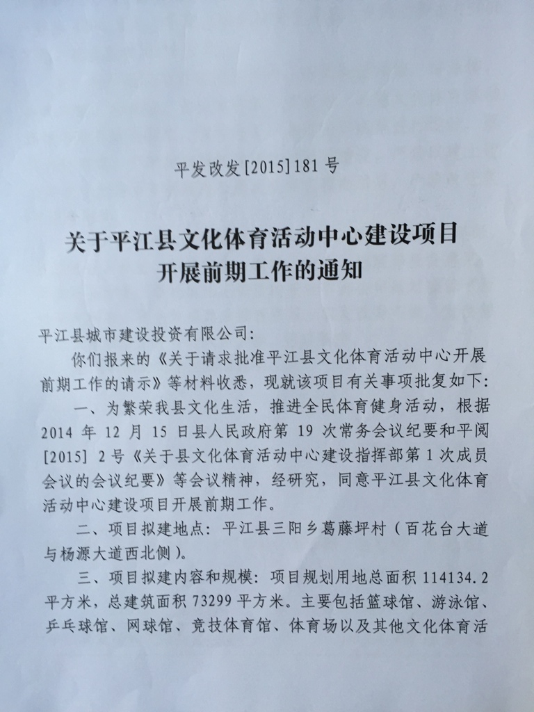 关于平江县文化体育活动中心建设项目开展前期工作的通知