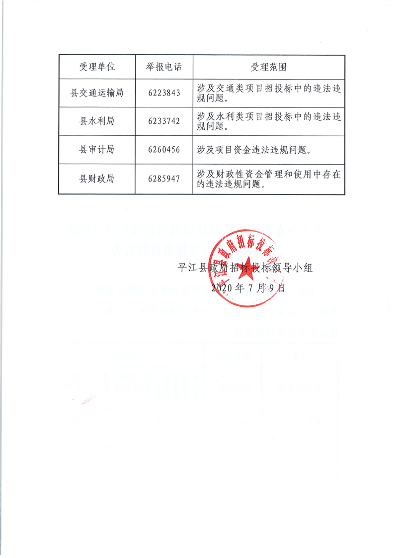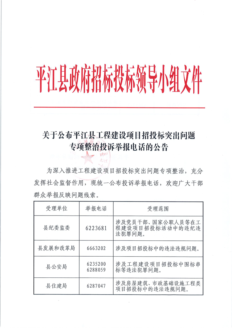 关于公布平江县工程建设项目招投标突出问题专项整治投诉举报电话的公告