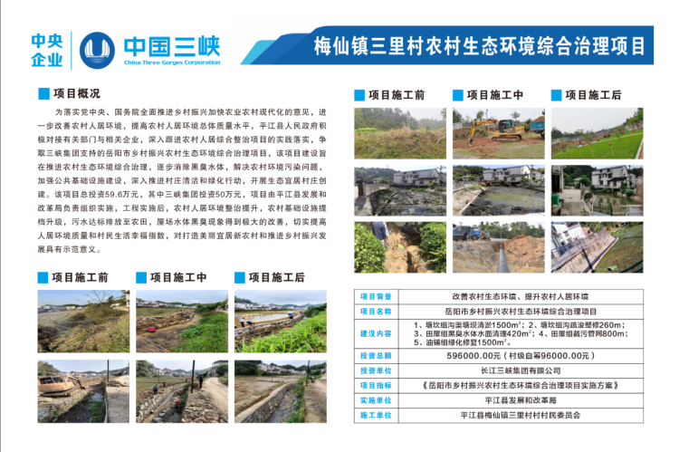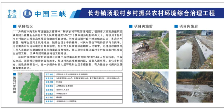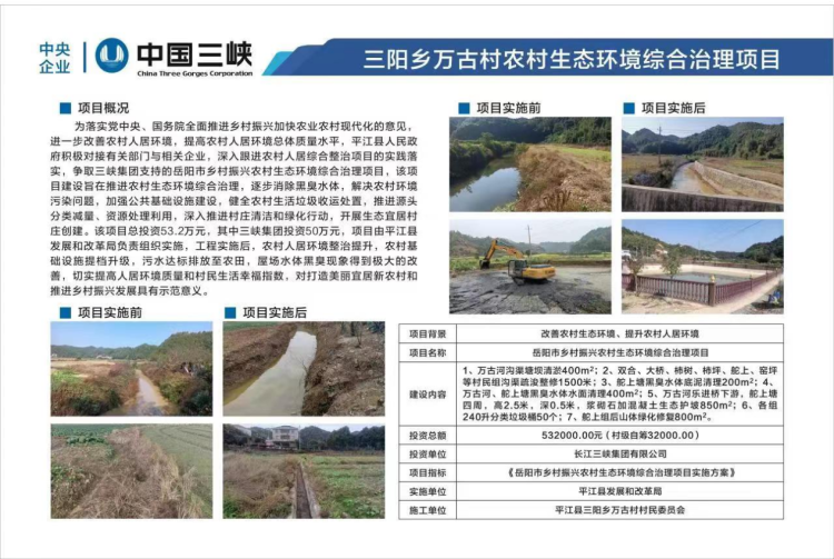 为深入贯彻落实乡村振兴战略,认真履行央企社会责任、践行使命担当,帮助薄弱乡村改善基础设施。2021年6月,中国三峡集团以“共抓长江大保护、共建绿色发展示范区”项目为抓手,从新修灌溉水渠、沟渠疏浚、黑臭水清理、垃圾分类桶普及、绿化修复等多方面着力,深入推进平江县梅仙镇三里村、三阳乡万古村、长寿镇汤塅村农村环境综合治理。据悉,三个项目总投资达165万余元,其中三峡集团支持建设资金150万元,至2021年底项目已全部完工。