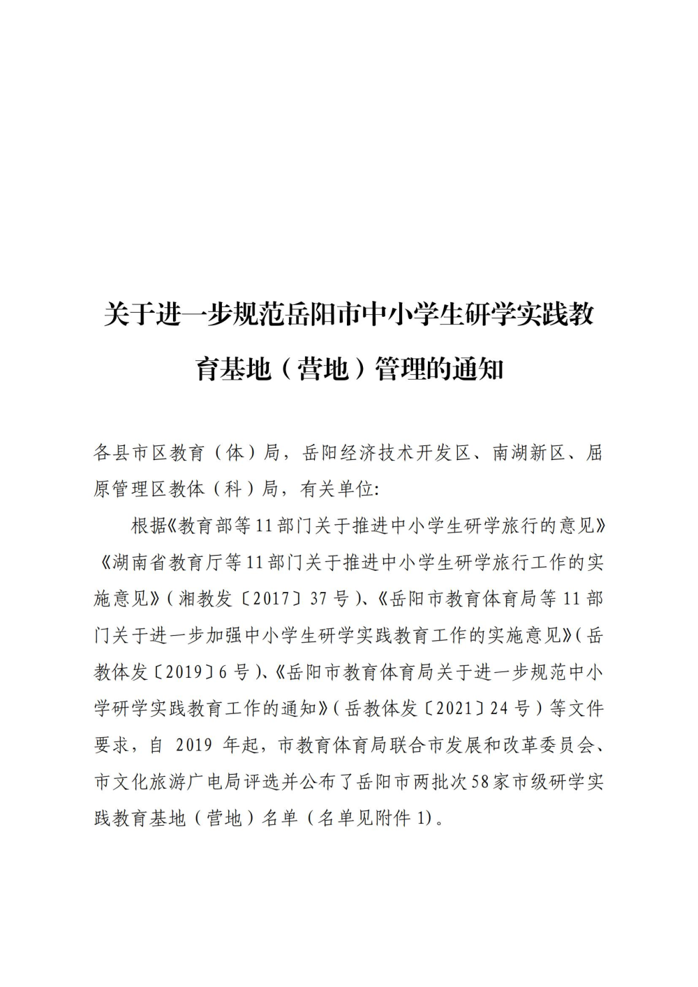 关于进一步规范岳阳市中小学生研学实践教育基地(营地)管理的通知