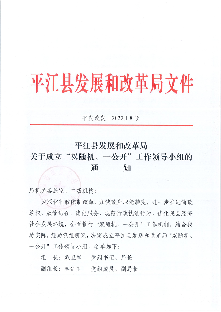 关于成立“双随机、一公开”工作领导小组的通知