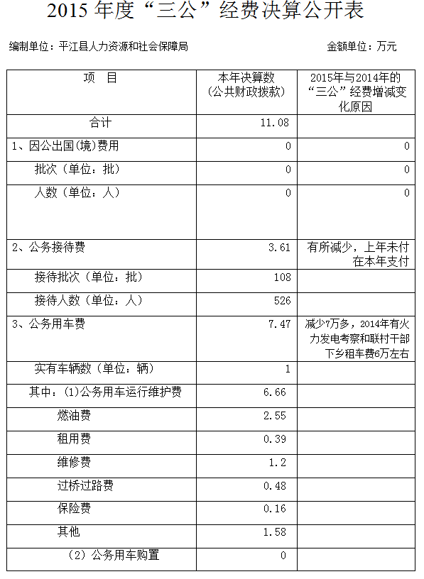 平江县人社局2015年三公经费决算公开表