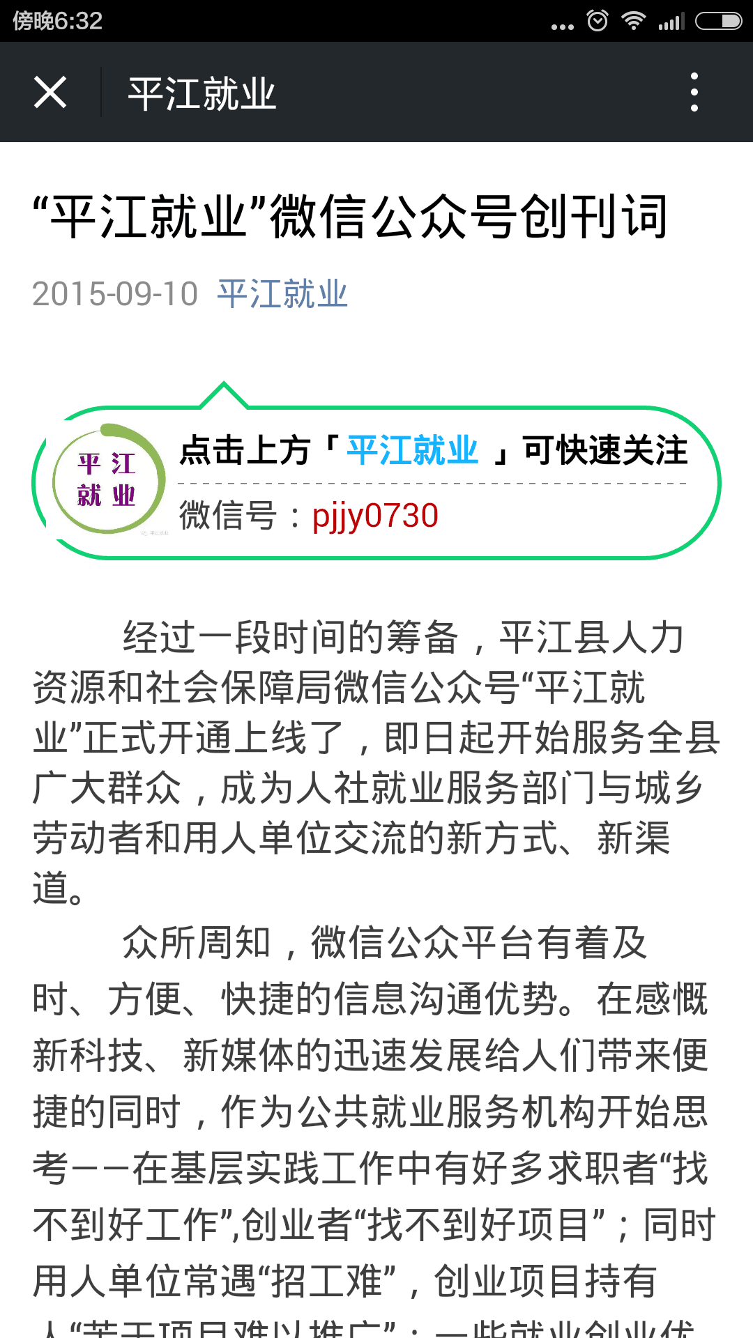 该微信公众平台是为促进平江就业创业而搭建的发布就业创业信息和提供就业创业服务的公益性综合平台。定期发布:招聘求职信息、职业指导信息、就业创业优惠政策、创业小知识、创业明星风采展示、创业项目库优秀创业项目征集、推介信息、创业孵化基地介绍、便民服务信息等。服务内容:免费提供人员招聘、职业技能培训、创业项目推介、政策咨询解答、职业指导服务、创业专家指导、小额担保贷款、创业一条龙等服务。