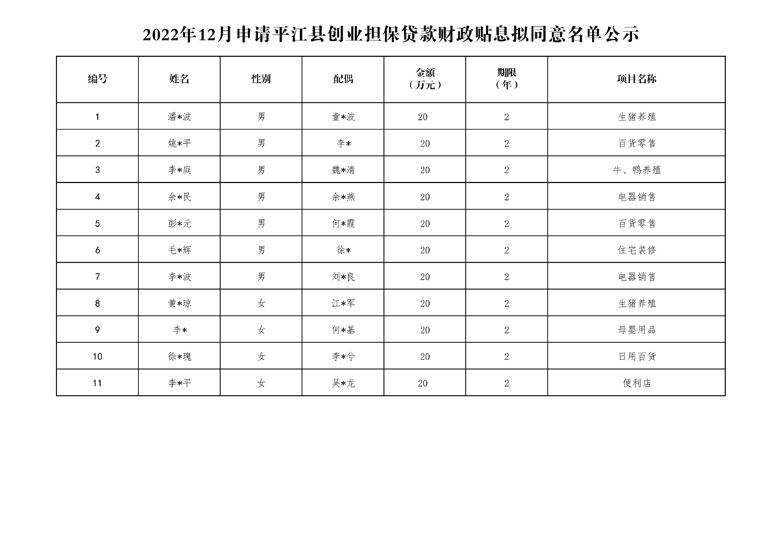 平江县创业担保贷款财政贴息拟同意名单公示(2022年12月)
