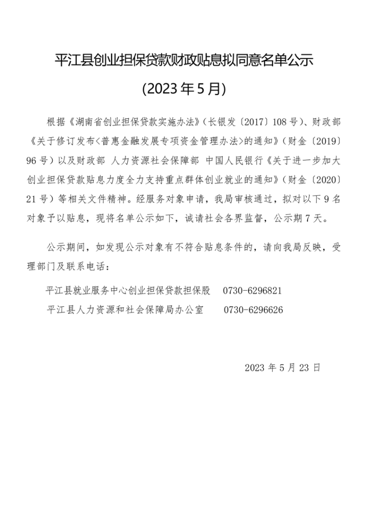2023年5月平江县创业贷款财政贴息拟同意名单公示