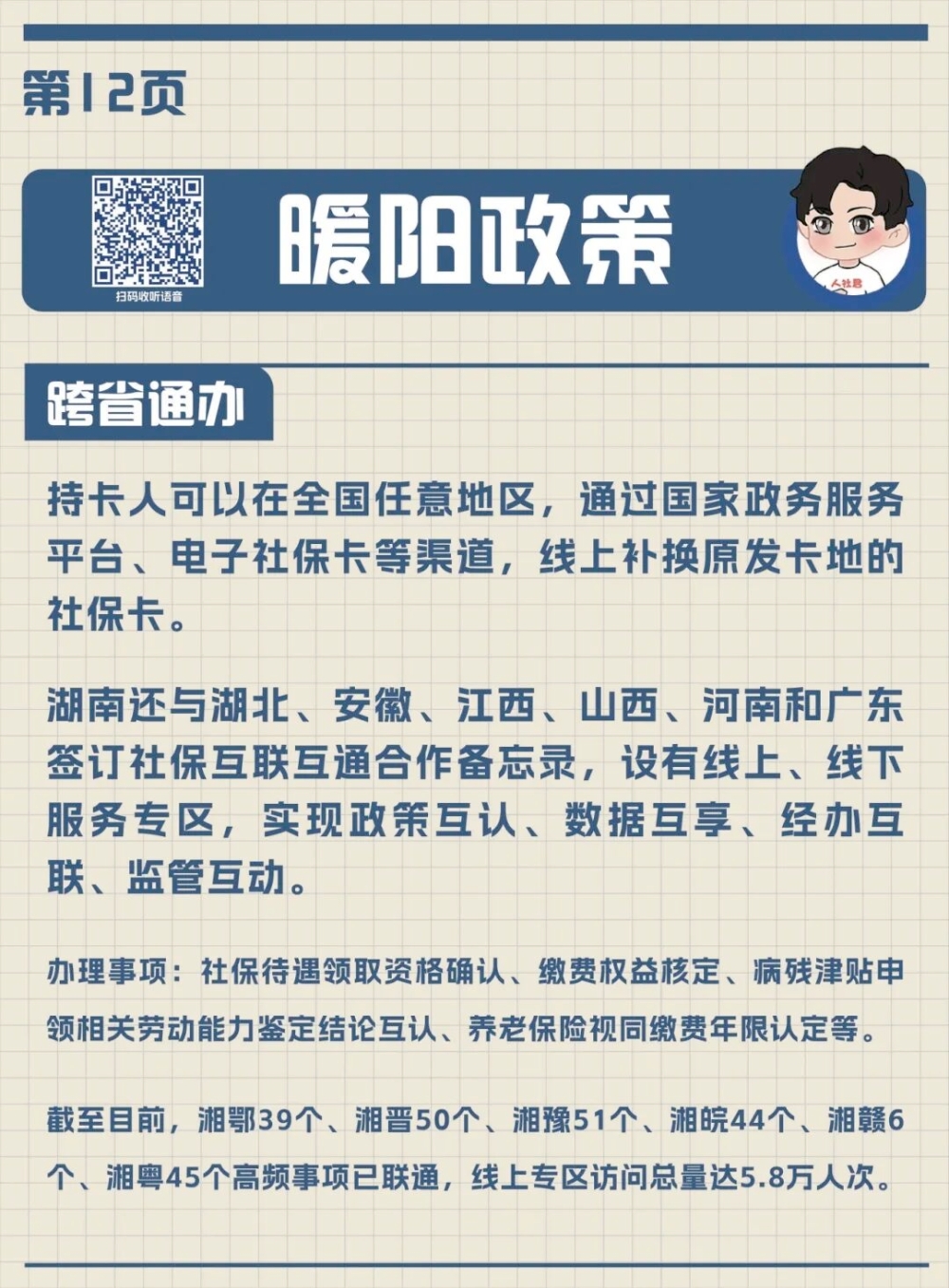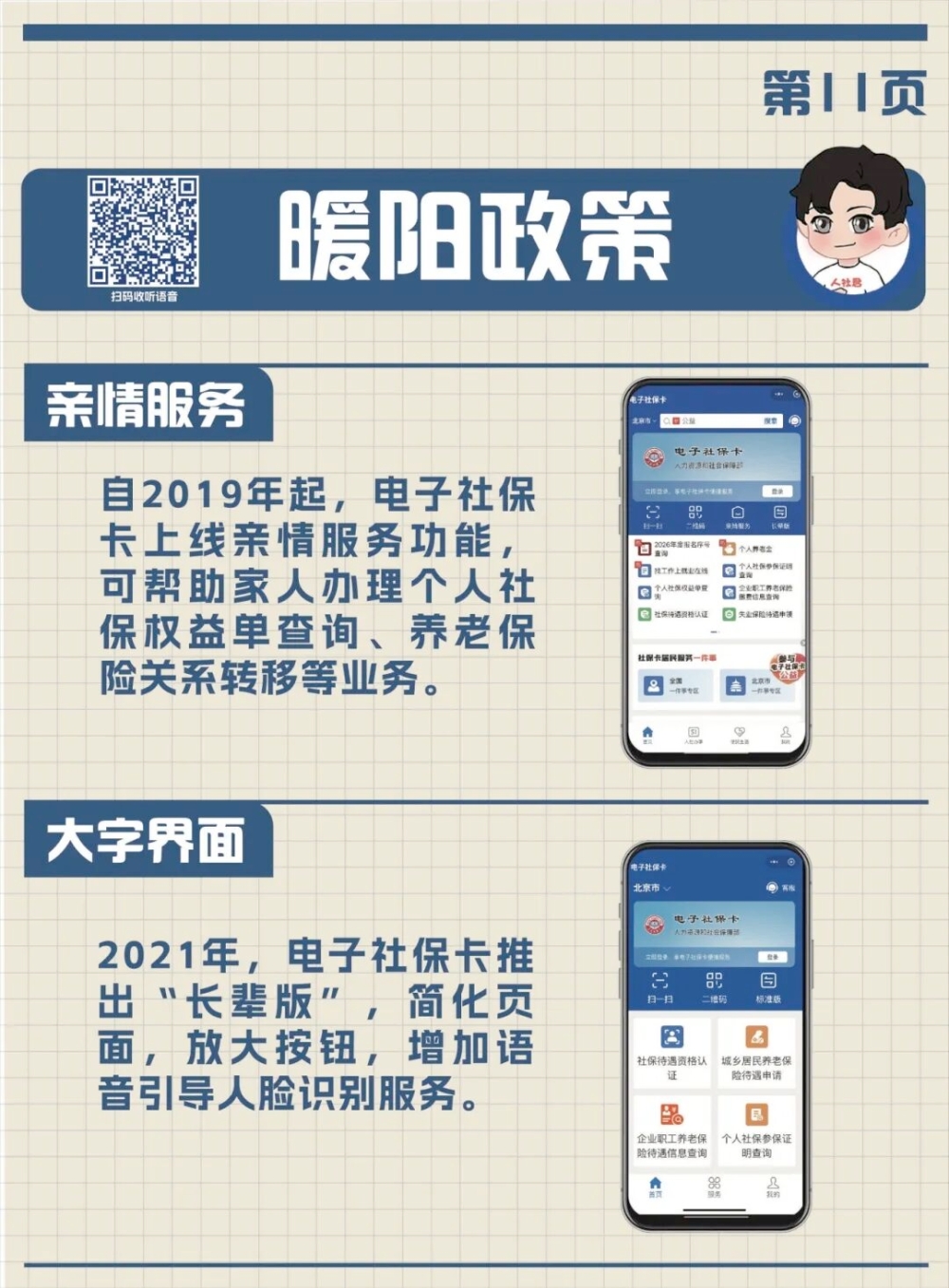 手册还贴心介绍了社保卡的“暖阳政策”,包括电子社保卡APP上线的亲情服务功能,推出的“长辈版”界面,增加的语音引导人脸识别服务,以及跨省通办服务。