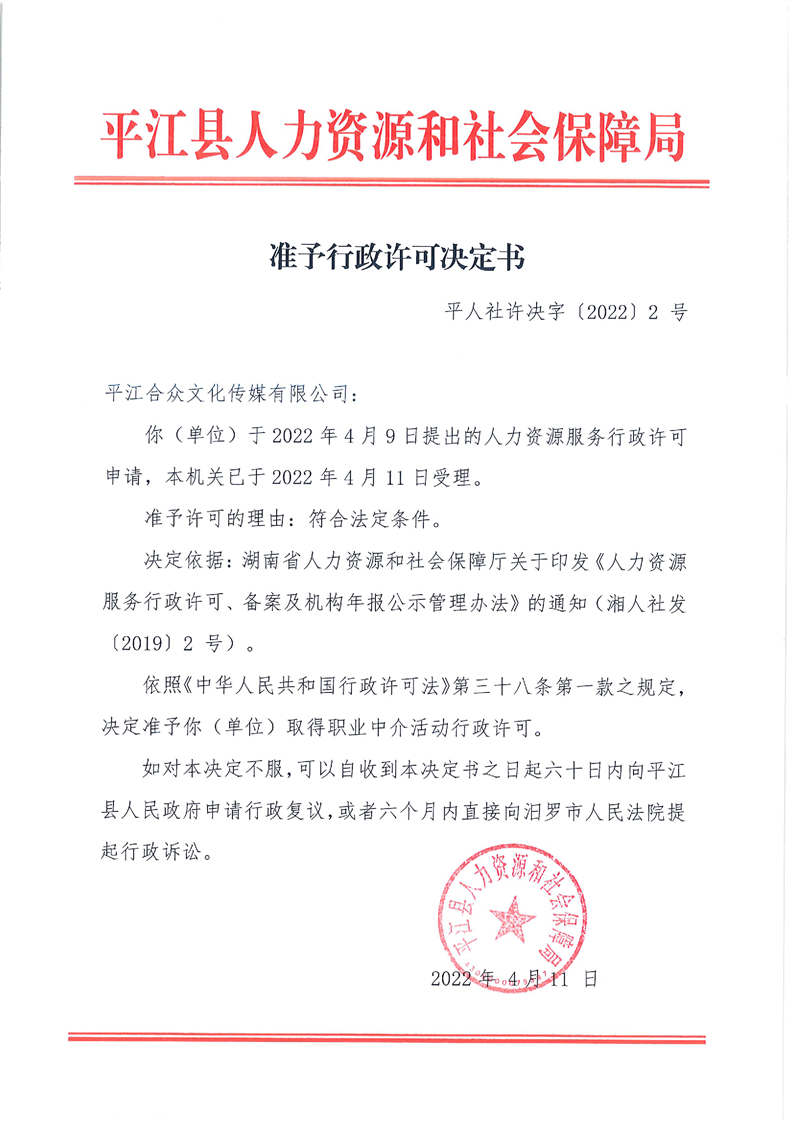 平江县人力资源和社会保障局准予行政许可决定书(平人社许决字[2022]2号)