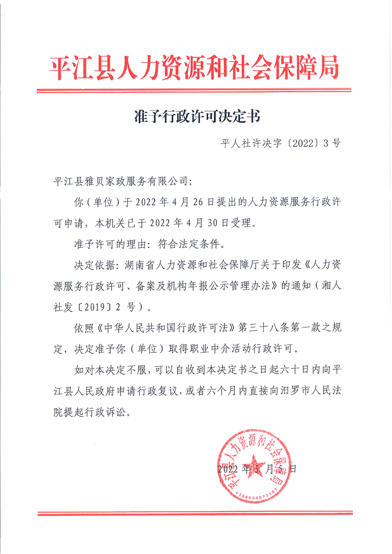 平江县人力资源和社会保障局准予行政许可决定书(平人社许决字[2022]3号)