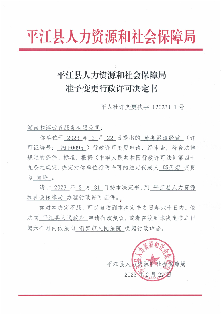 平江人力资源和社会保障局行政许可决定书(平人社许变更决字[2023]1号)
