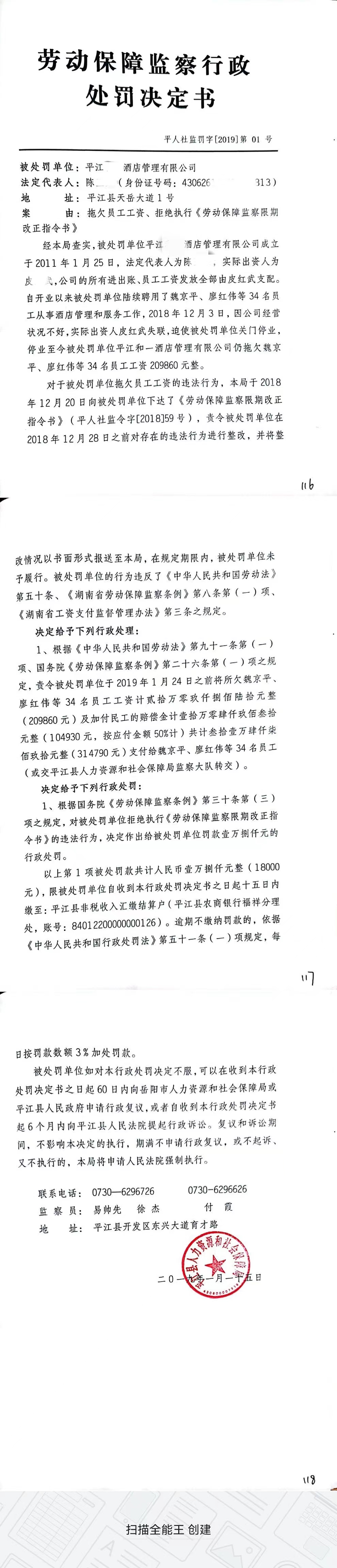 劳动保障监察行政处罚决定书(平人社监罚字[2019]01号)