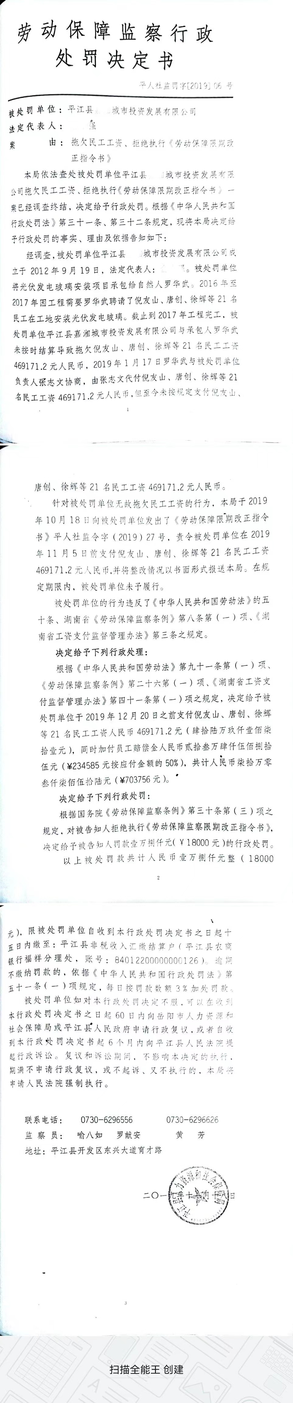 劳动保障监察行政处罚决定书(平人社监罚字[2019]06号)