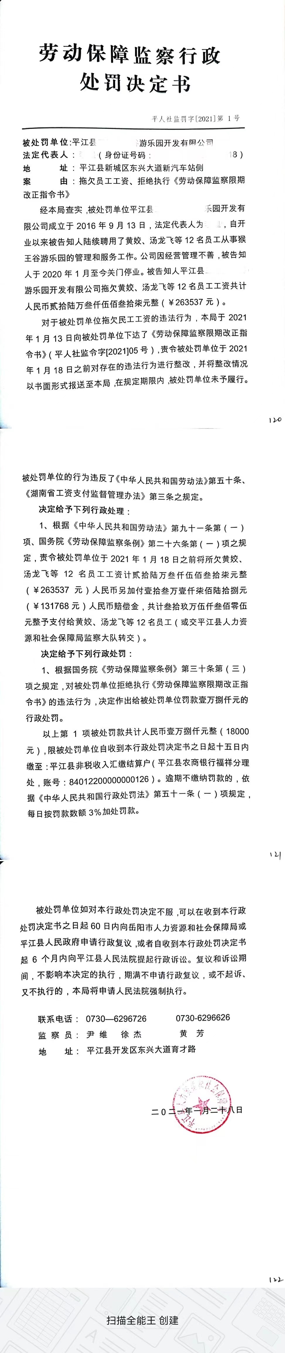劳动保障监察行政处罚决定书(平人社监罚字[2021]01号)