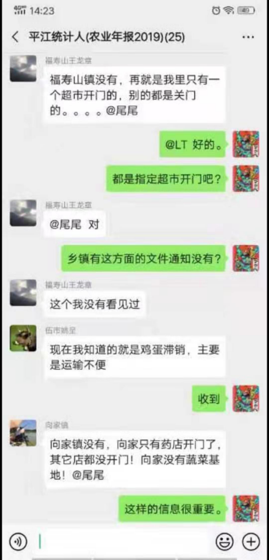 为及时掌握新冠疫情对本县农业农村经济的影响情况,平江县统计局一二产业股农业统计负责人通过采取电话、微信、QQ的询问方式,对全县24个乡镇进行了一次畜禽养殖、蔬菜基地、水果基地、农产品交易四个方面的调查。各乡镇统计员通过网络向县局反映“草莓基地丰收,但受疫情影响无法销售”,“因交通运输不便导致鸡蛋滞销”,“乡镇几乎只保留一个指定超市营业,以保障人民生活物资需要”等重要信息。