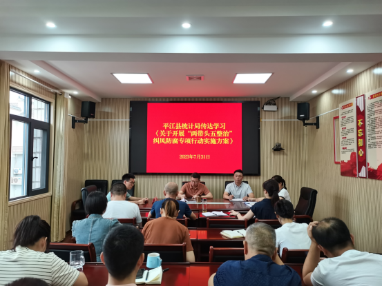 为深入贯彻落实习近平新时代中国特色社会主义思想主题教育和纪检监察干部队伍教育整顿。7月31日,县统计局召开专题会议,传达部署“两带头五整治”纠风防腐专项行动,全体干部职工参会。