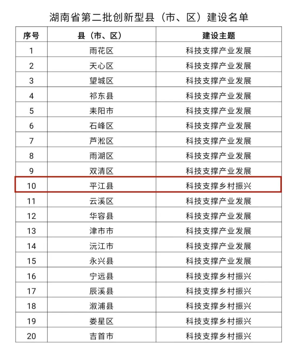 近日,湖南省科技厅公布了湖南省第二批创新型县(市、区)建设名单平江县以“ 科技支撑乡村振兴”为主题成功入选