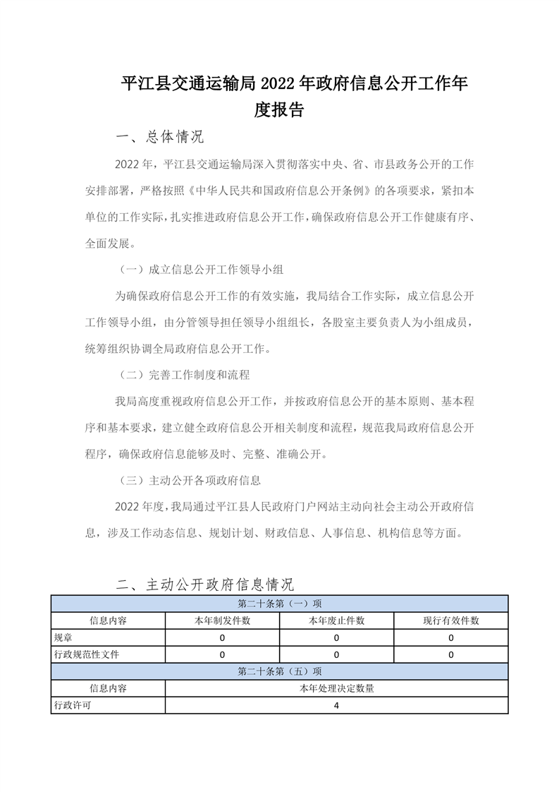 平江县交通运输局2022年政府信息公开工作年度报告