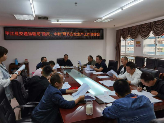 会上,传达了《湖南省交通运输厅关于做好当前及2020年中秋节和国庆节期间安全生产工作的紧急通知》的文件精神,印发了《平江县交通运输局关于做好当前及“国庆节、中秋节”两节期间安全生产工作的紧急通知》,并对两节期间交通运输安全工作进行安排部署。