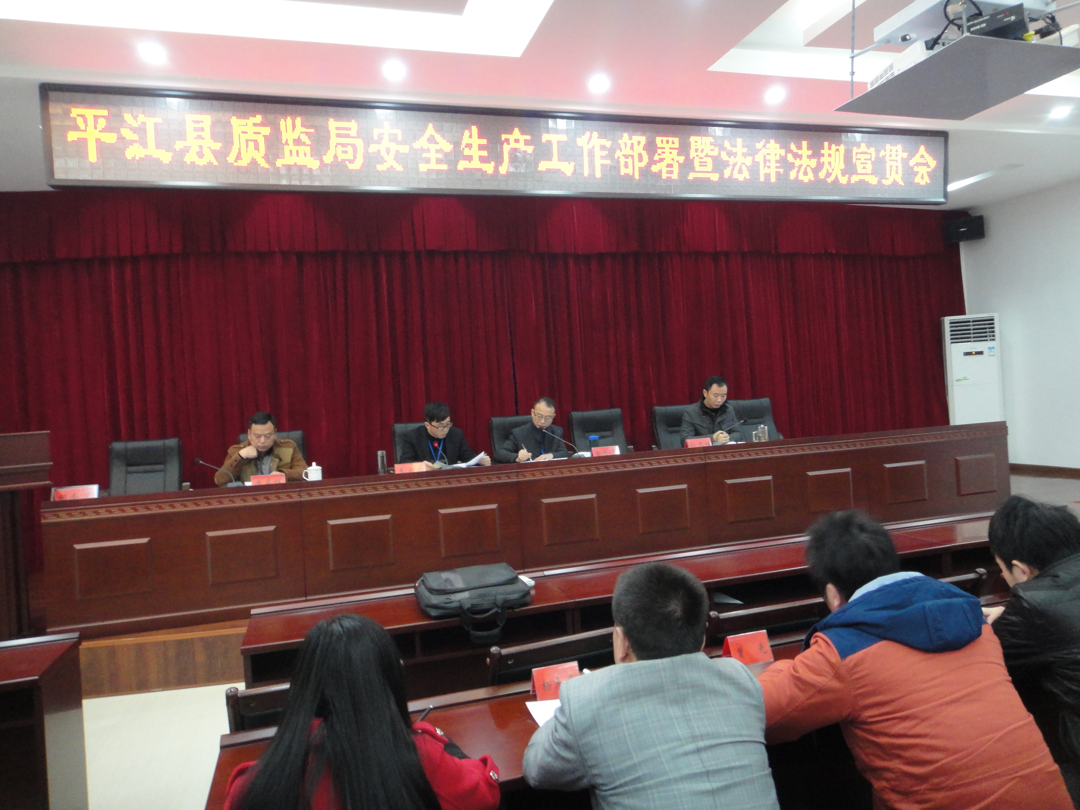 1月22日下午,县质监局召开安全生产工作部署暨法律法规宣贯会,重点部署2015年全局安全生产工作,组织学习了新《安全生产法》和传达上级有关安全生产工作会议精神。会议由副局长向志峰同志主持,全体干部职工参加会议。
