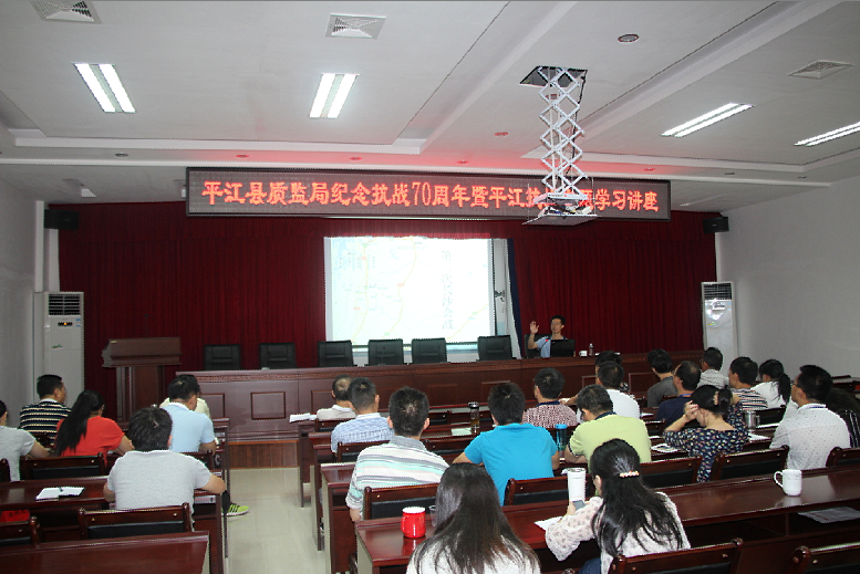 今年是抗日战争胜利70周年,8月19日上午,县质监局组织全体干部职工开展“抗日战争在平江”专题教育活动。活动邀请县教育局高级教师徐校雄老师为干部职工上了一堂名为“抗日战争在平江”的抗战史专题课,结合了当时的国际国内形势,分析了当日平江在抗日战争中发挥的重要作用,详细分析讲解了那段屈辱的血泪史和中国人民不屈不挠的抗战精神,使干部职工清晰感受到抗战的艰难,激发了干部职工的爱国热情和民族意识,懂得了如何珍惜今天的幸福生活。干部职工纷纷表示,专题课向他们展现了中国充满血泪和屈辱的过去、充满挑战和严峻形势的现在,对今后工作的开展具有很大的推动作用。(平江县质监局办公室)