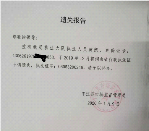 兹有平江县市场监督管理局执法大队执法人员黄凯,身份证号:4306261979****0058,于2019年12月将湖南省行政执法证不慎遗失,执法证号:06053200246,特此声明作废。