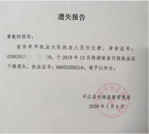 兹有平江县市场监督管理局执法大队执法人员方立新,身份证号:4306261972****0039,于2019年12月将湖南省行政执法证不慎遗失,执法证号:06053200216,特此声明作废。